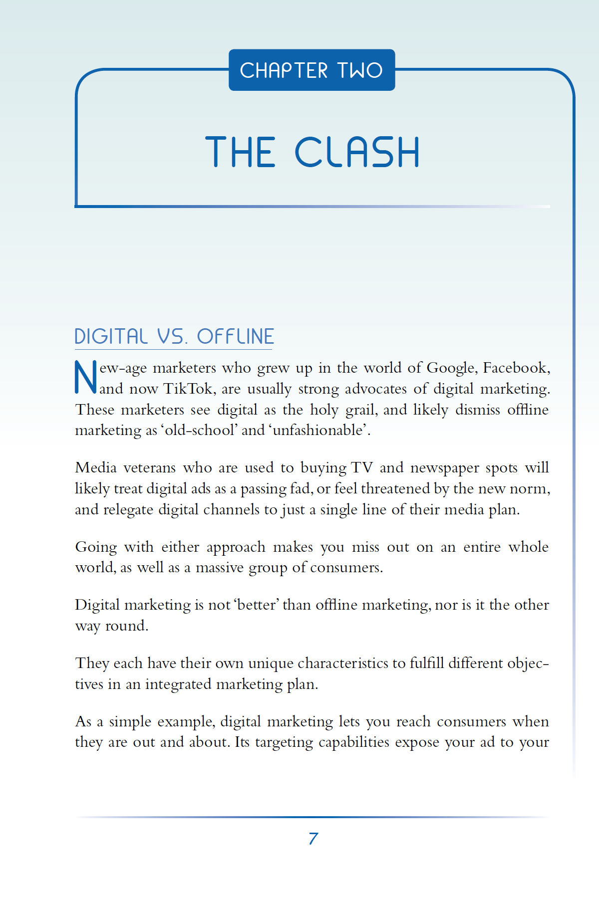 There are two focuses in this book. Firstly, it will slant towards offline marketing. It is not to say that offline marketing is the priority. Rather,it is to complement the digital marketing knowledge shared in the first book.